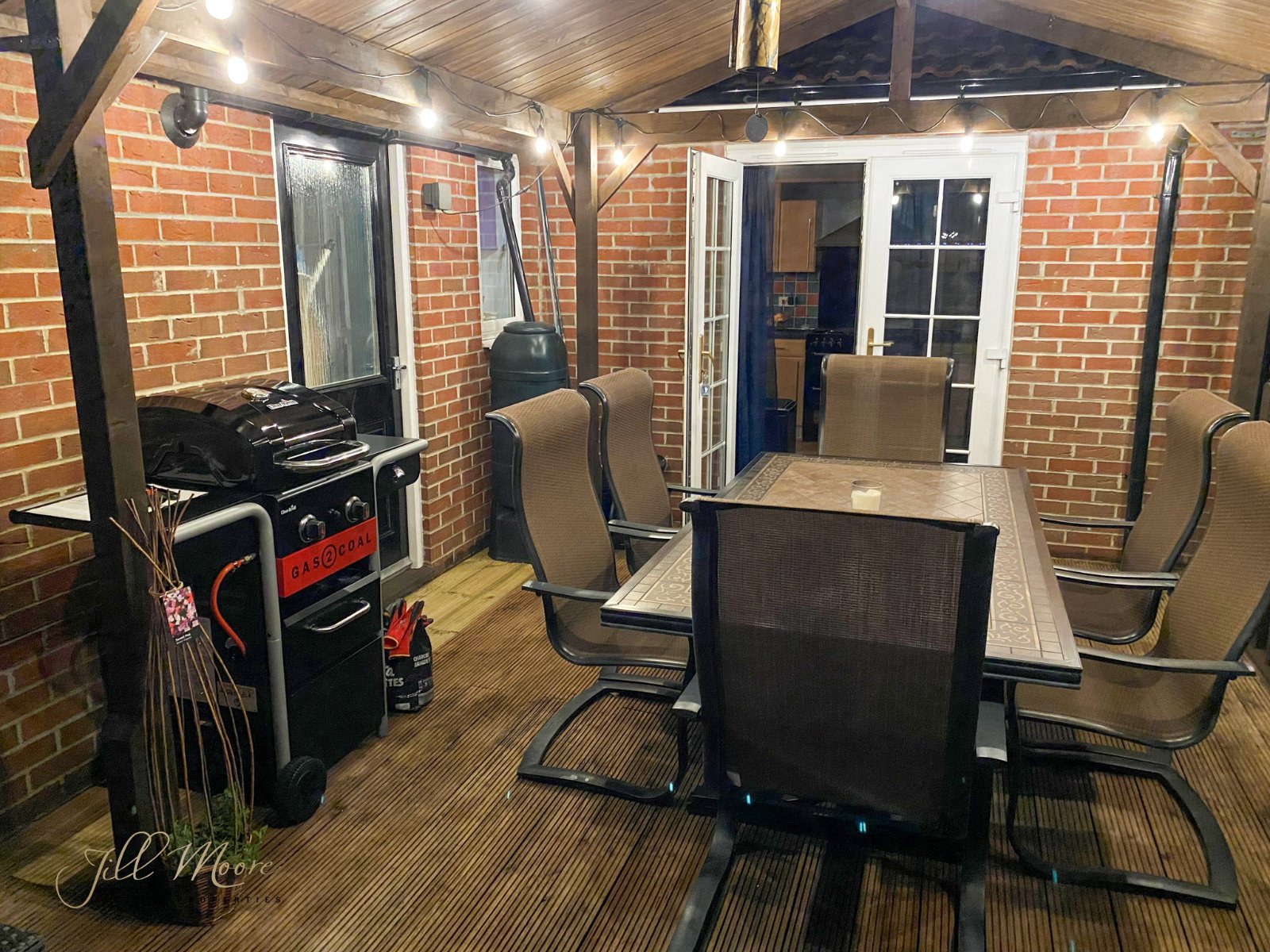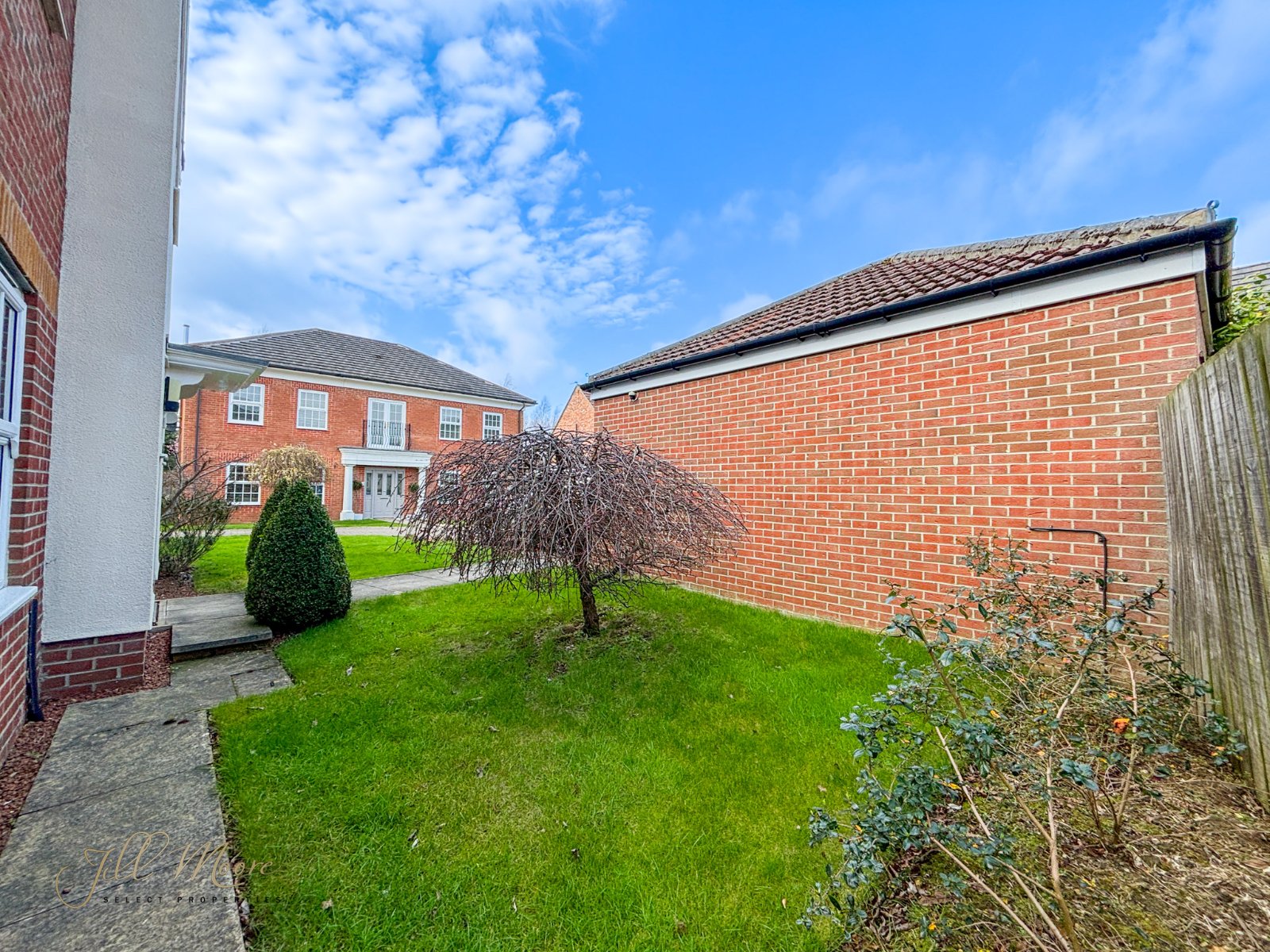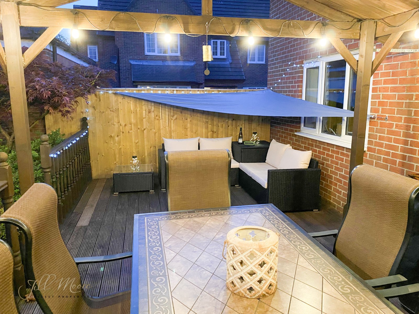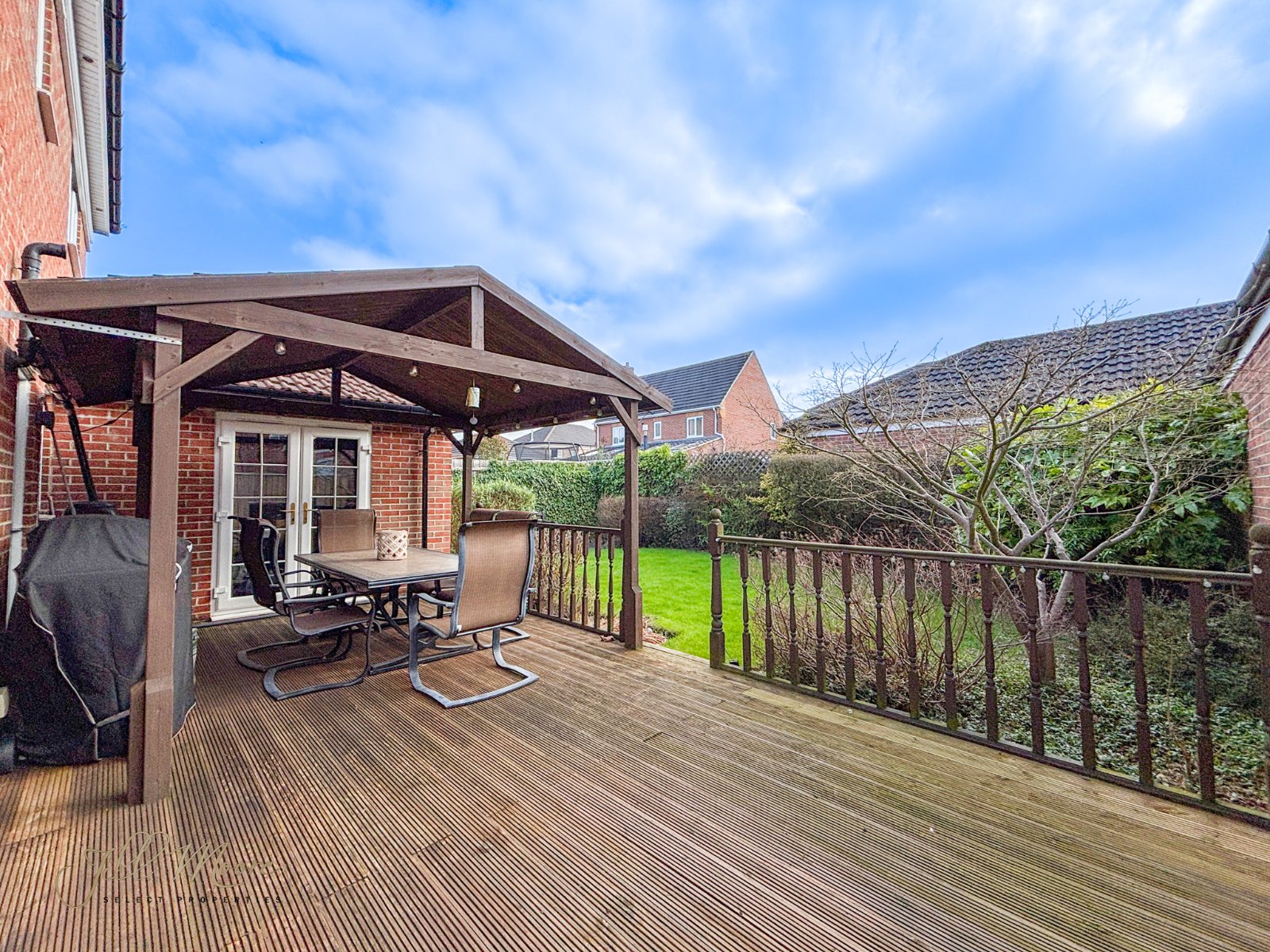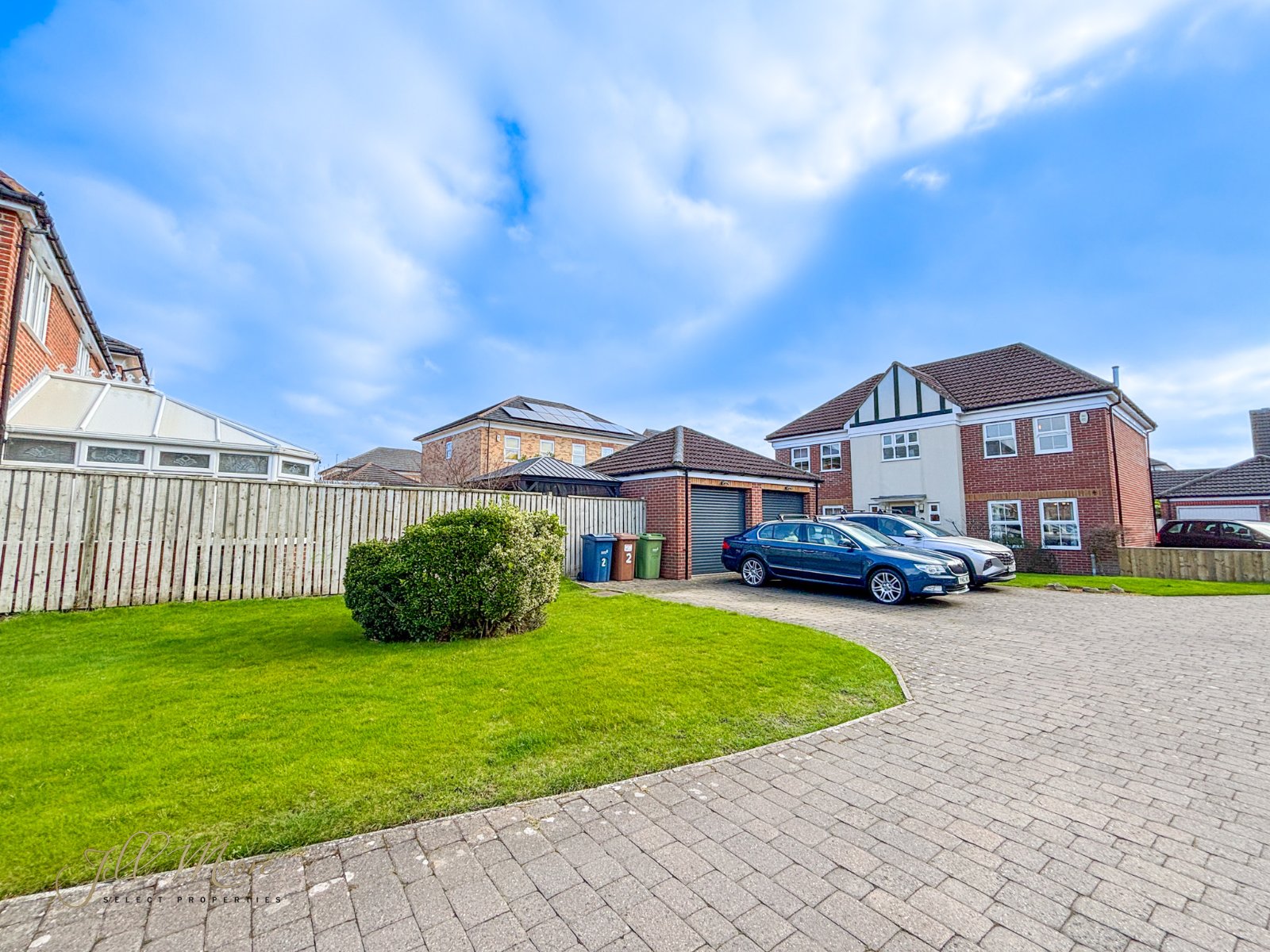 To the rear, a well maintained private south facing enclosed rear garden complete with natural grass section, pergola structure and paved pathway which leads round down the side of the property to the front via entrance/exit gate. The front, a large private driveway provides ample space for multiple vehicles and leads up to detached double garage. Garage features two automated roller shutter doors and EV charging point.