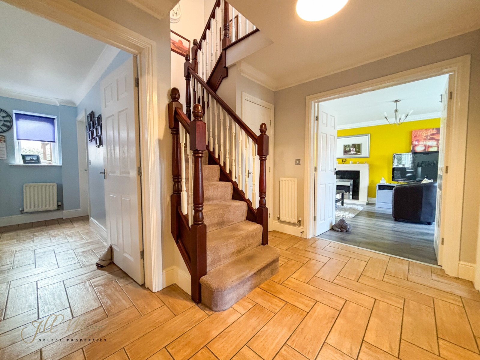 The welcoming hallway space is complete with tiled flooring, neutral walls, carpeted stairs lead to first floor and doors off to lounge, kitchen/diner, cinema room, w/c and storage cupboard.