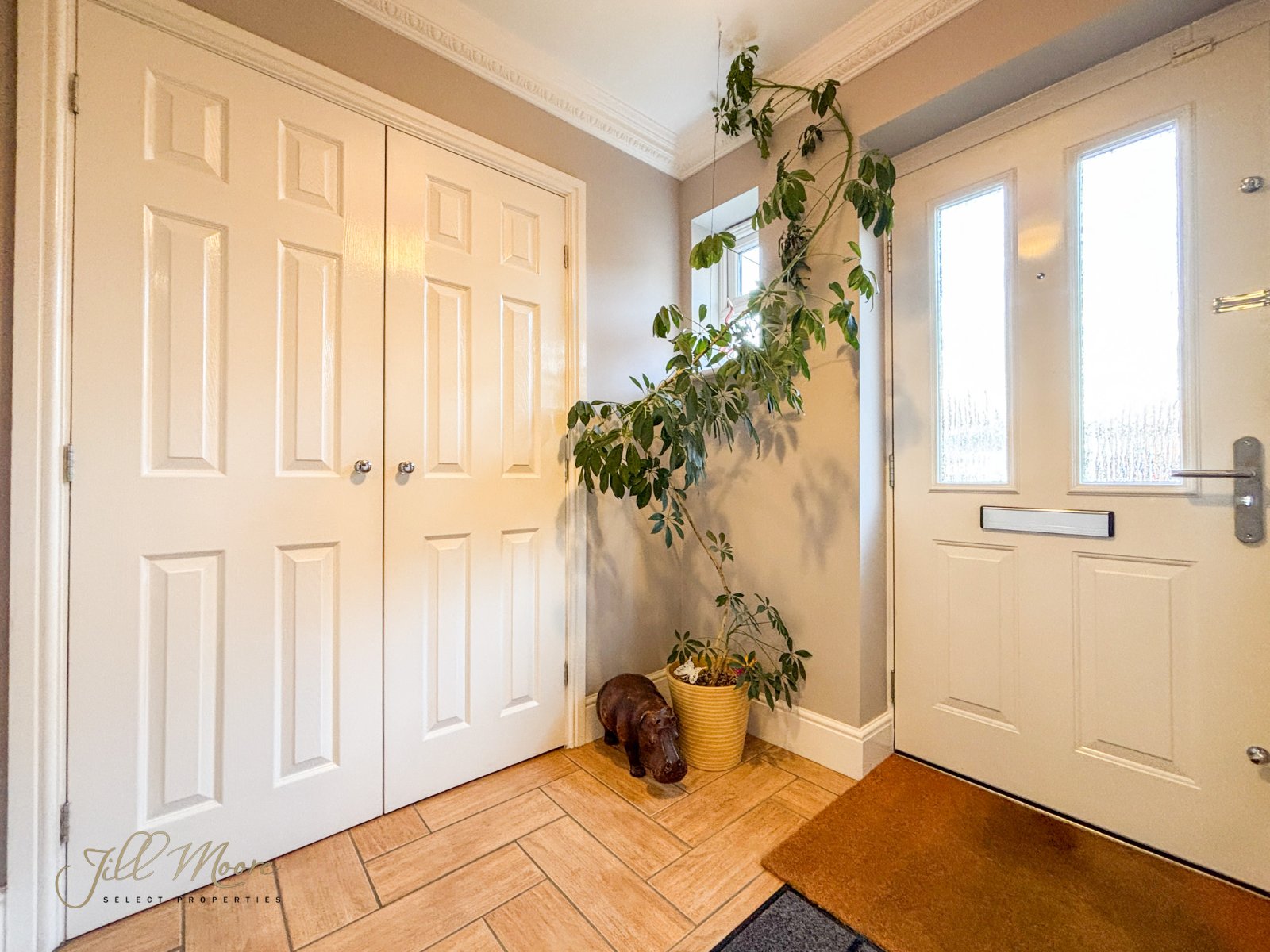 Enter through composite double glazed door into large porch area with built in storage space, tiled floors, neutral walls and internal double doors leading into the main hallway.
