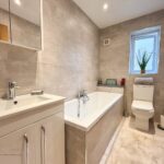 The good-sized bathroom features bath, low level hand wash basin, toilet, towel rail/radiator, tiled walls and floors and double glazed privacy window.
