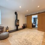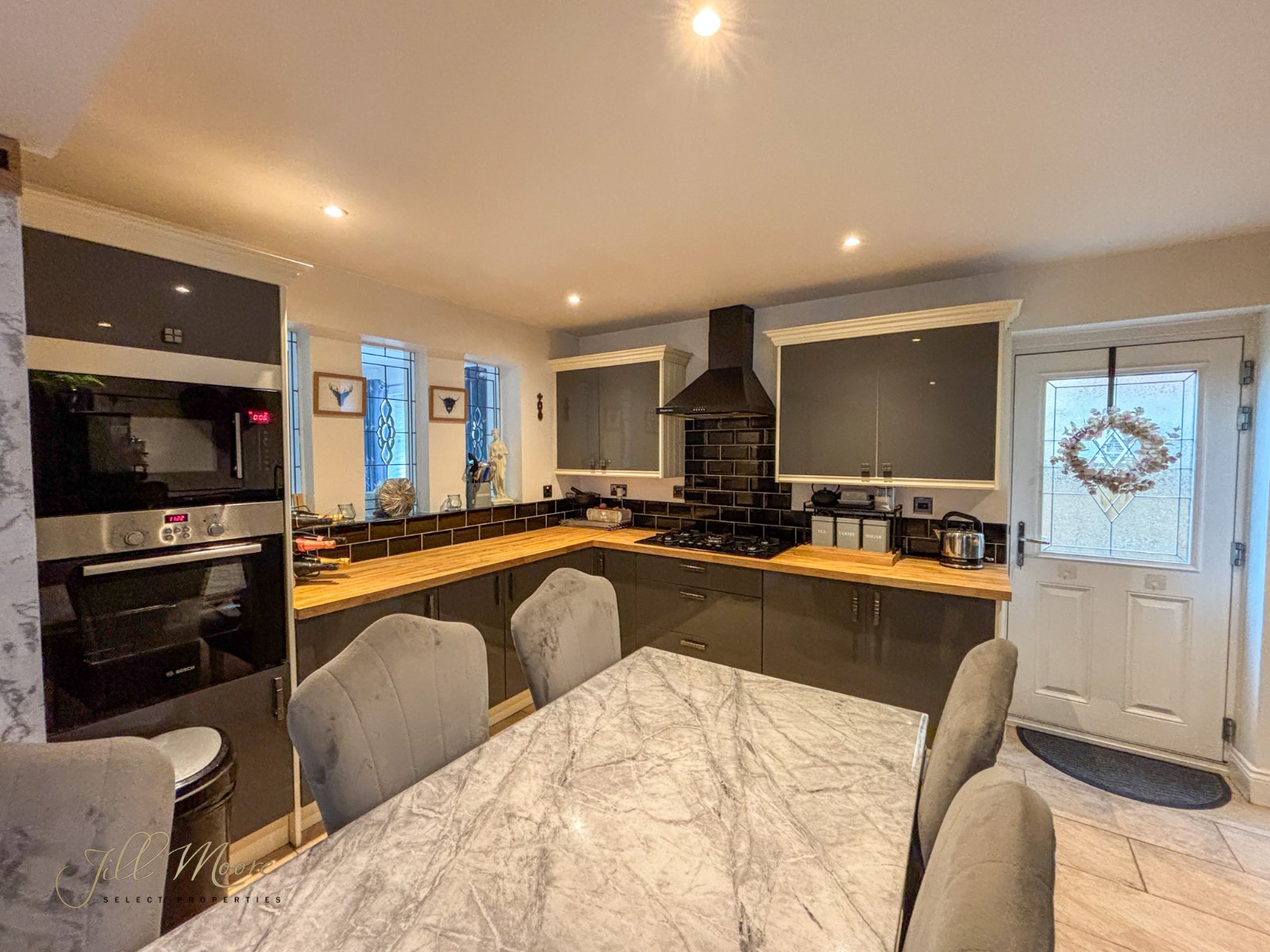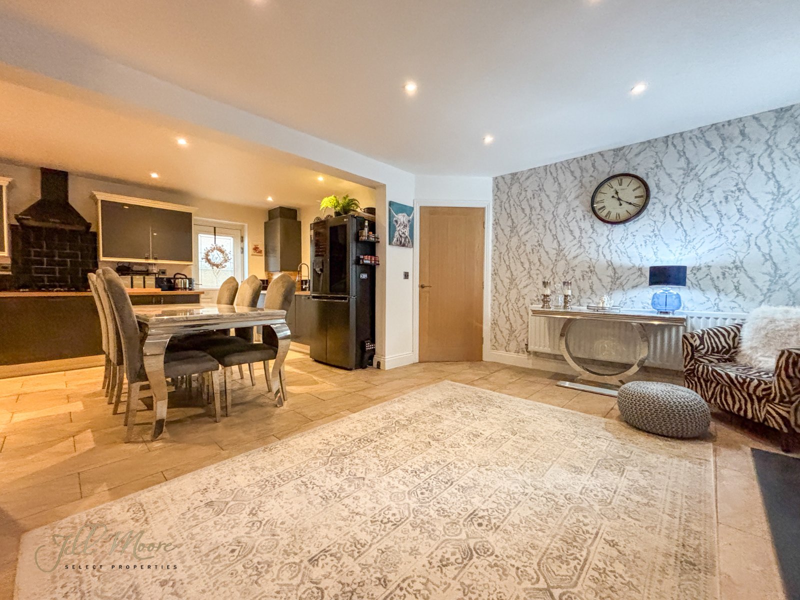 The beautifully finished open plan kitchen/diner area is complete with base and wall units providing ample storage, part-tiled walls/splash back, integrated hob, grill, microwave and oven with space for fridge/freezer. Ornate internal stained glass windows look into the lounge space and double glazed composite door leads out into the rear garden/down side of property. The welcoming dining space is complete with luxury carpet flooring, neutral walls, spot lighting, double glazed window, log burner feature and sliding internal solid oak doors leading into the lounge.